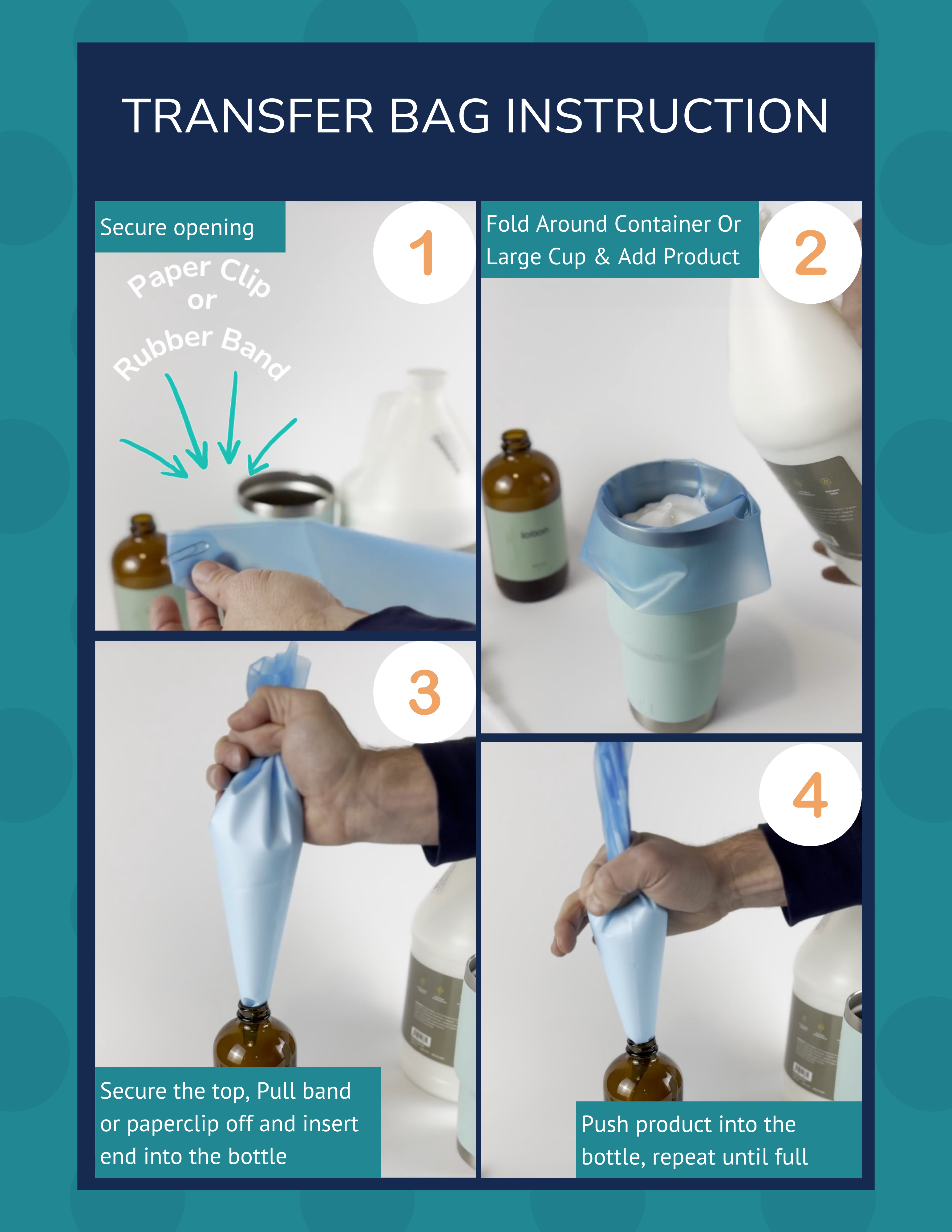 Simply clip or rubber band the piping bag at the bottom, put it in a large cup or container and fold around the edges, fill with product and transfer to the bottle. Checkout our video for a quick view on how to use.